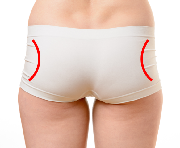 A common dysfunctional pattern for hip and lower pain is overuse and tightness of the gluteal muscles at the back of the hip. This pattern can be seen as a deep concavity in the sides of the buttocks when standing relaxed (as shown – red lines).