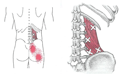the lower back) can also cause pain referred to the hips. For example, the Quadratus Lumborum muscle in the back (see image) will commonly
