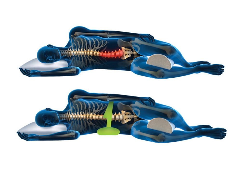 If you like to sleep on your side a support under your trunk can help to reduce painful side bending. Try laying on the side of your sciatica with a support (such as a small pillow or the PropAir Sleeper) positioned betwen you ribs and pelvis.