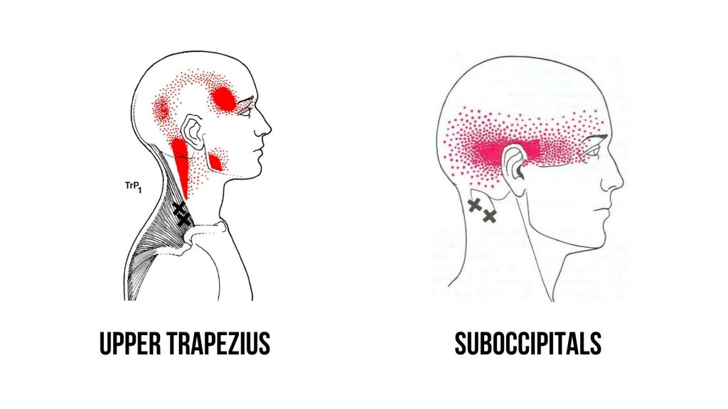 A common source of tension headache are the muscles around the neck and shoulders. Two common culprits are the suboccipital muscles (the small muscles at the base of the skull) and the upper traps (which sit on top of your shoulders). When irritated these muscles can refer pain around the temples and behind the eyes – the typical pattern for a tension headache.